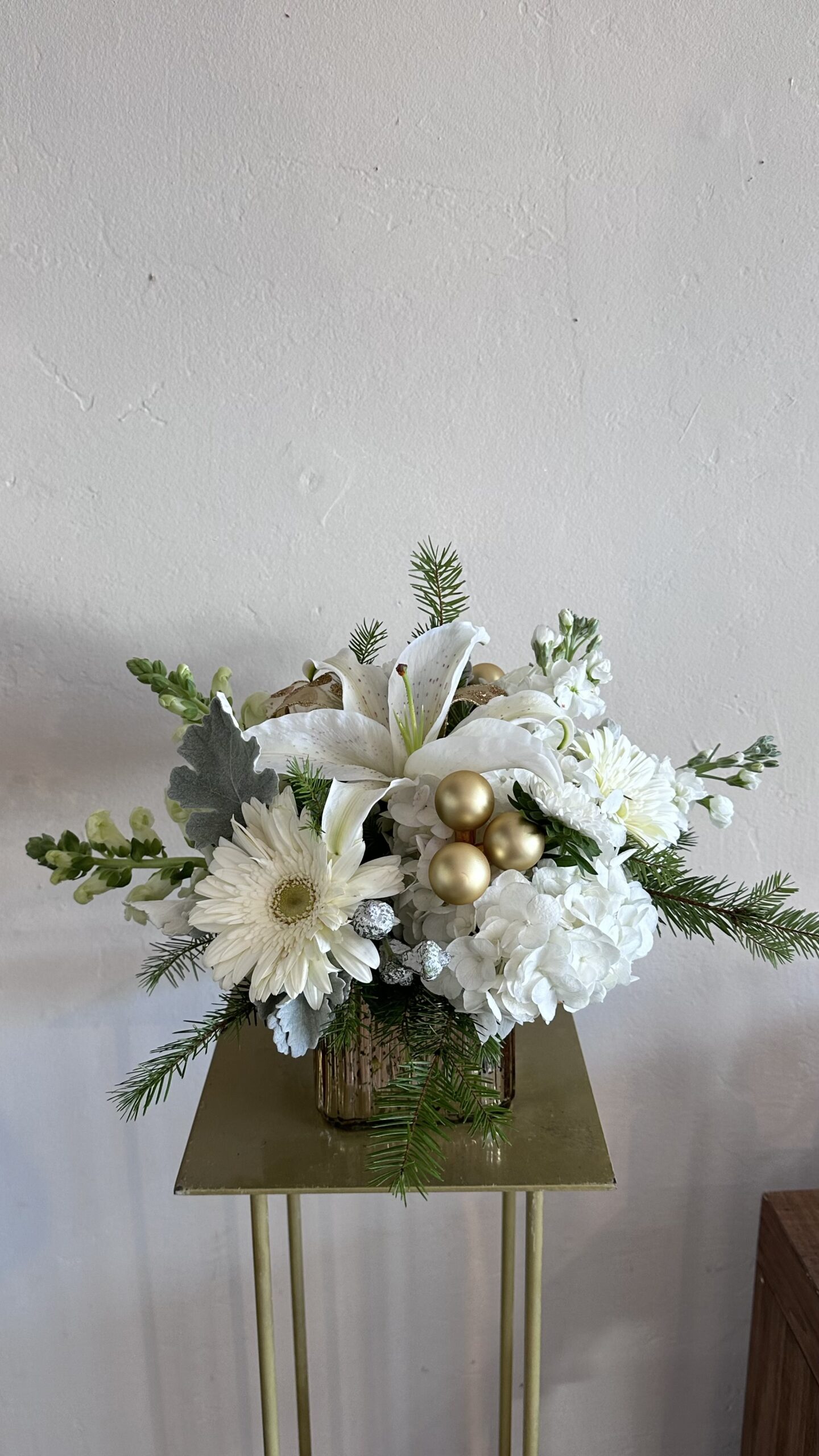 Gold square vase with white seasonal florals, winter pines, and gold ornaments.